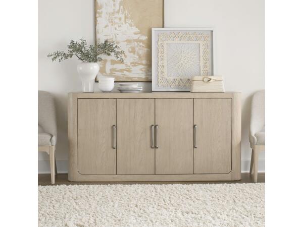 This dining server features a stylish faux concrete top and satin pewter bar pull hardware. It offers ample storage with a hidden felt-lined drawer, soft-closing drawer guides, and adjustable shelving behind four doors.