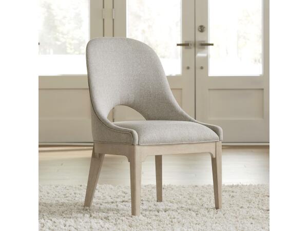 This upholstered side chair features textured gravel fabric with a comfortable barrel back and sloped arms. The design is supported by tapered legs, offering a blend of modern style and comfort for any dining space.