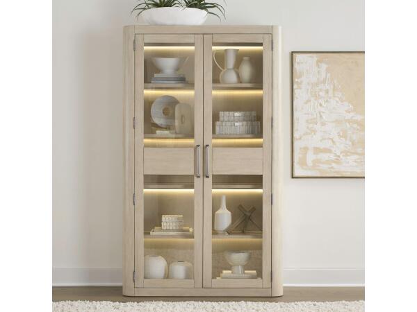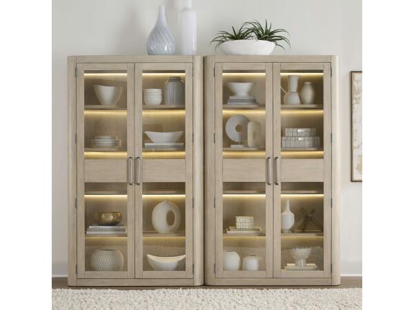 Designed for creating a custom display wall, this bunching cabinet features full-length wood-framed glass doors and four fixed glass shelves. Integrated touch LED lighting illuminates your showcased items.