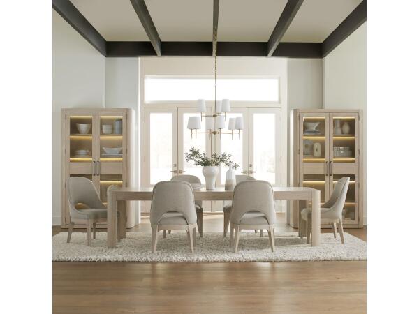 This rectangular leg table features softly shaped edges and wide rounded legs. It includes a removable 24-inch leaf that extends the table to 110 inches, making it a versatile statement piece for dining.