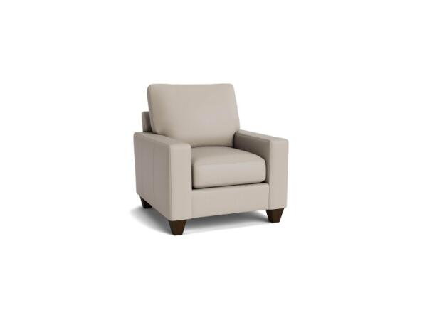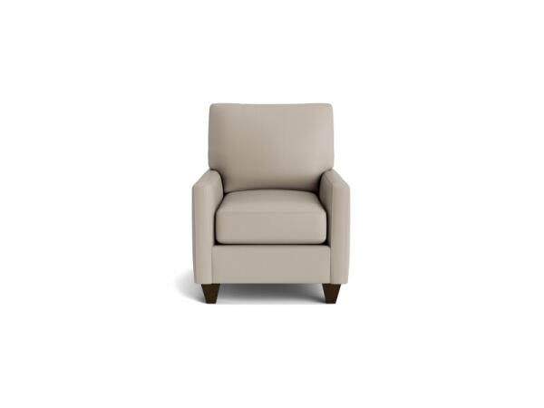 Accent chair with gently rolled arms and a clean silhouette, customizable in designer fabrics and cushion comfort. Measures 39 in. H x 35 in. W x 38 in. D.