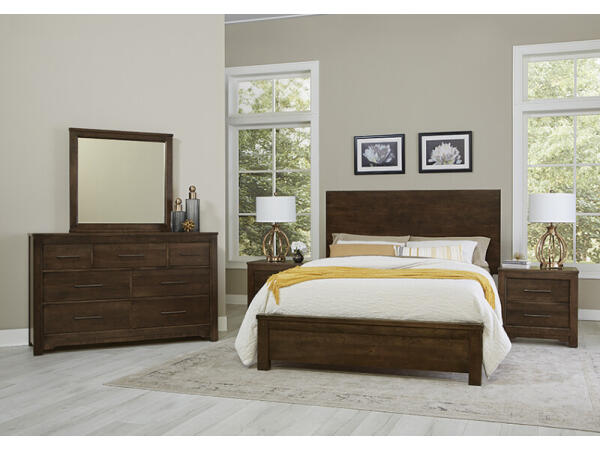 Transitional plank bed in solid American cherry with a 1 in. thick headboard and wide rails for a contemporary platform look. Made in the USA with mortise-and-tenon construction; available in Queen, King, and Cal King.