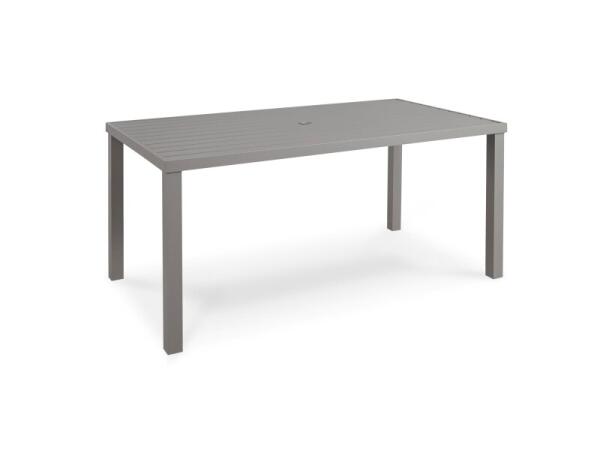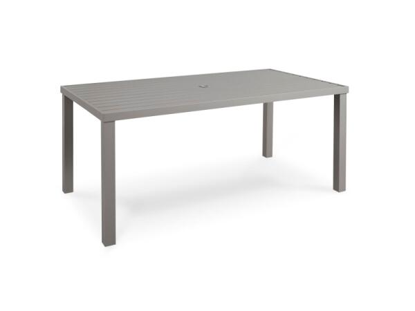 Rectangular aluminum outdoor dining table with a grooved solid top that simulates slats and an umbrella opening with plug; seats 6. Crafted in Alabama.