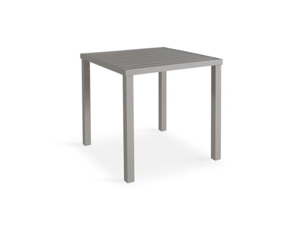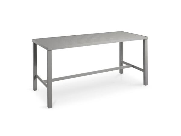 Bar-height outdoor dining table in powder-coated aluminum with a slatted-look top and umbrella hole; seats 4. Measures 38.3 in. W x 38.3 in. D x 42 in. H; crafted in Alabama.