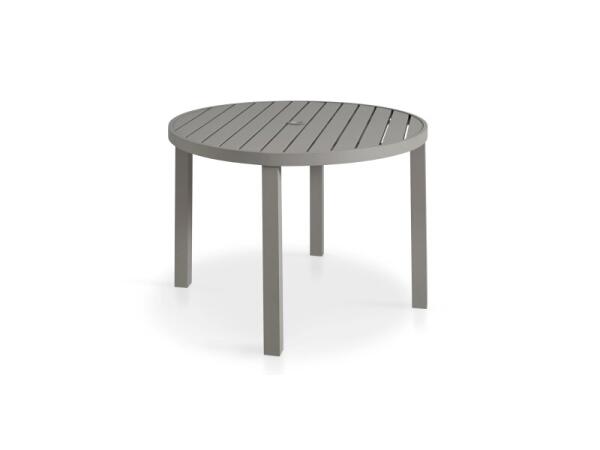 Powder-coated aluminum outdoor dining table with a slatted-look top and umbrella hole; seats 6–8. Measures 84 in. W x 38.5 in. D x 30 in. H; crafted in Alabama.