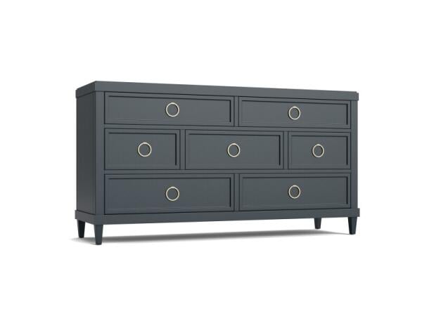 Seven-drawer wood dresser with neo-classic lines, cedar-lined bottom drawers, and a stepped top that evokes crown molding. Offered in semi-opaque colored finishes with bold ring pulls.