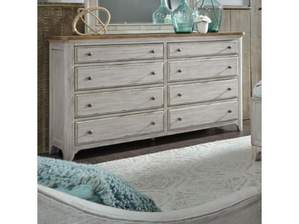 This Farmhouse Reimagined 8-drawer dresser features an antique white finish with chestnut tops and antique brass hardware. Crafted from pine solids and veneers, it offers felt-lined top drawers, cedar-lined bottom drawers, and dust proofing.
