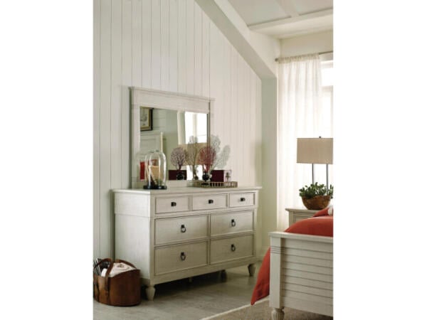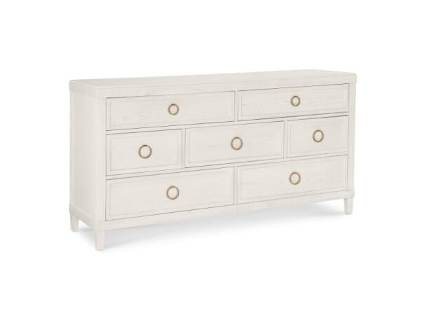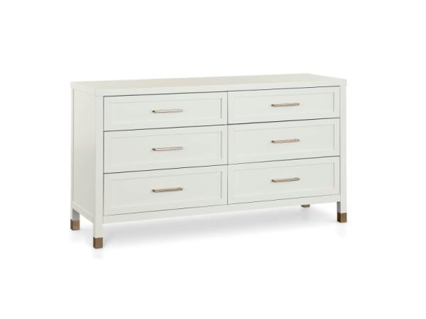 Six-drawer dresser in Hampton White with raised drawer framing, satin brass bar pulls, and soft-close, dovetailed drawers. A cedar-lined bottom drawer adds extra protection for linens.