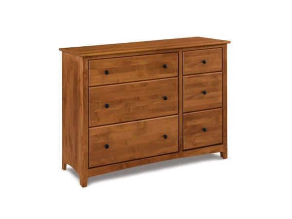 Six-drawer dresser in knotty white oak with vertical-grain fronts and turned wood knobs. Soft-close glides and cedar-lined bottom drawers; available in Flaxen or Truffle finishes.