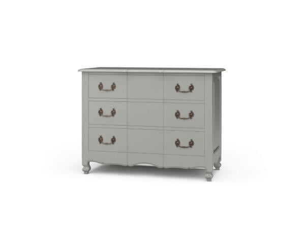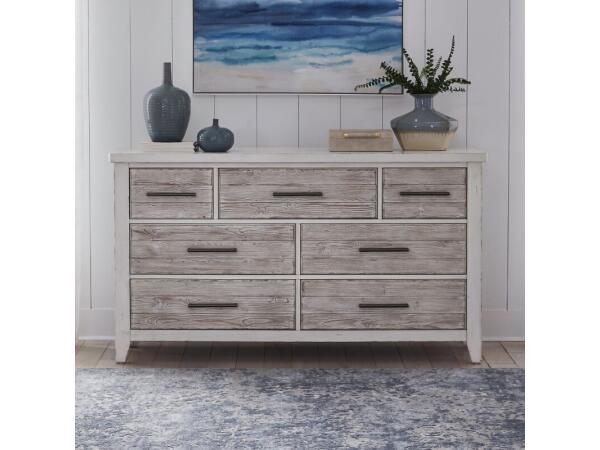 Crafted from Poplar solids and Spruce veneers, this seven-drawer dresser features a two-tone Weathered White and Parchment Brown finish. It includes soft-closing drawers, felt-lined top drawers for delicates, and cedar-lined bottom drawers for aromatic st