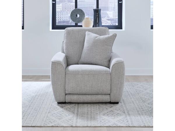 This right arm recliner features dual power zero wall recline with a synchronized power headrest and independent controls for comfort. It includes a butter knife arm and ultra soft plush seating.