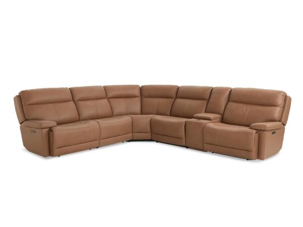 Top‑grain leather power reclining sectional with zero‑gravity end seats and power headrests. A padded storage console with cup holders and USB keeps essentials close.