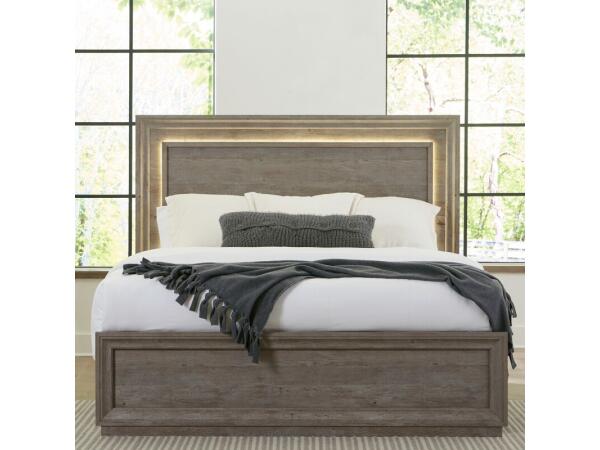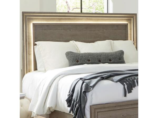 This King panel headboard features a floating panel design with warm LED touch lighting for ambient room illumination. Constructed from rubberwood solids and paper laminate with a Graystone finish.