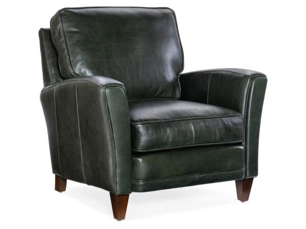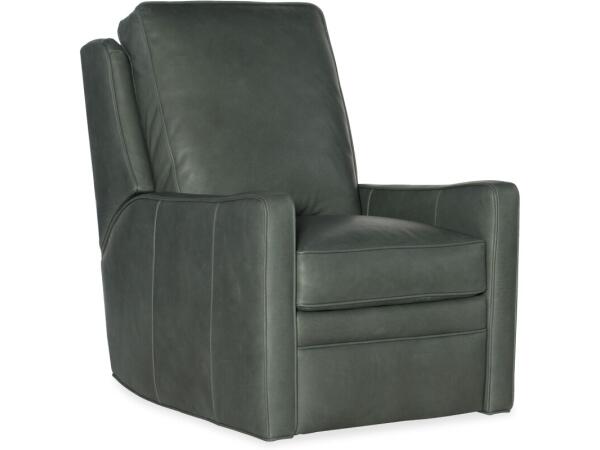 Leather lay-flat manual recliner with track arms, channeled headrest, and tapered wood legs for a clean accent-chair look. Optional tall back and power, USB port, and 30 in. W x 40 in. D x 42 in. H.