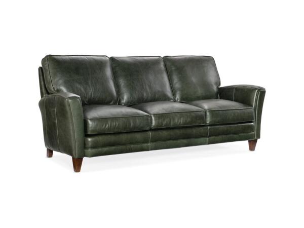 Leather track-arm recliner with lay-flat, manual push-back comfort, channeled headrest and tapered wood legs for a modern living room. Optional power mechanism available.