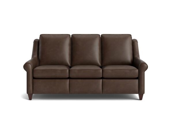 Leather roll-arm reclining sofa that looks like a stationary piece yet delivers relaxed comfort with power reclining options and endless positions. Includes a USB port and needs only 1 in. clearance to recline.