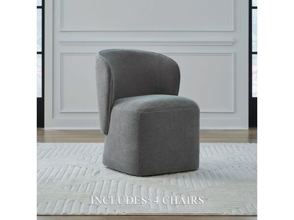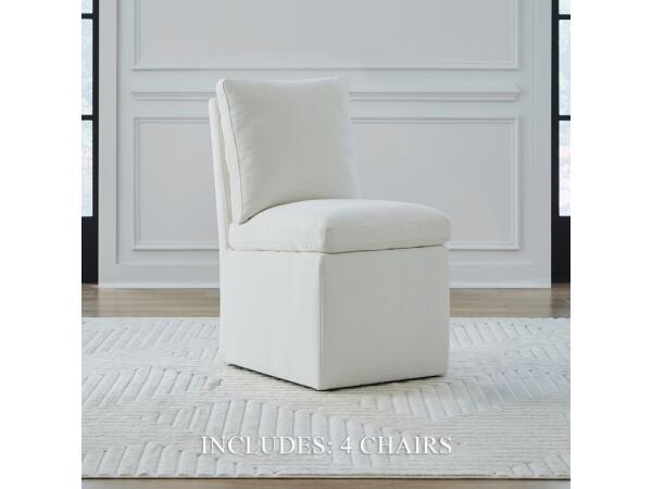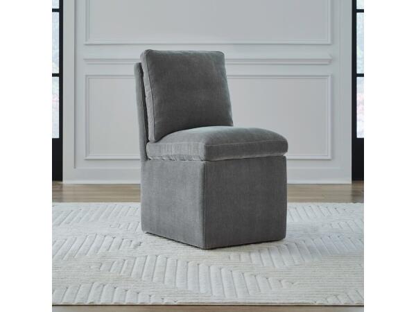 This versatile accent dining chair is fully upholstered in Sapphire fabric with pillowtop seat and back cushions. Equipped with casters for easy mobility, it functions well as a host, side, or accent chair.