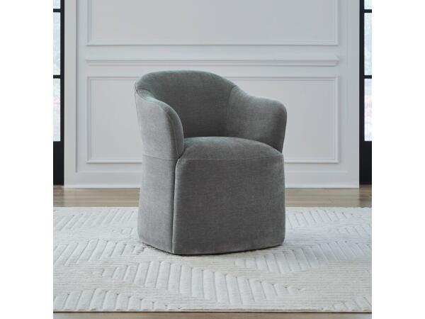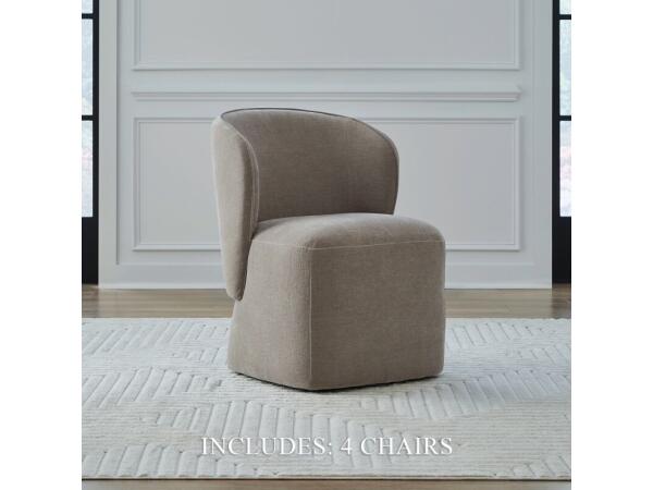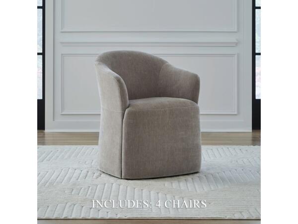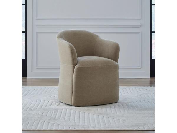 This elegant accent dining chair in Truffle fabric features gently sloping curves, an arched cap rail, and flared arms for sophisticated style. Equipped with casters for easy mobility, it functions perfectly as a versatile dining or accent chair.