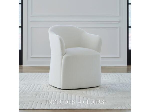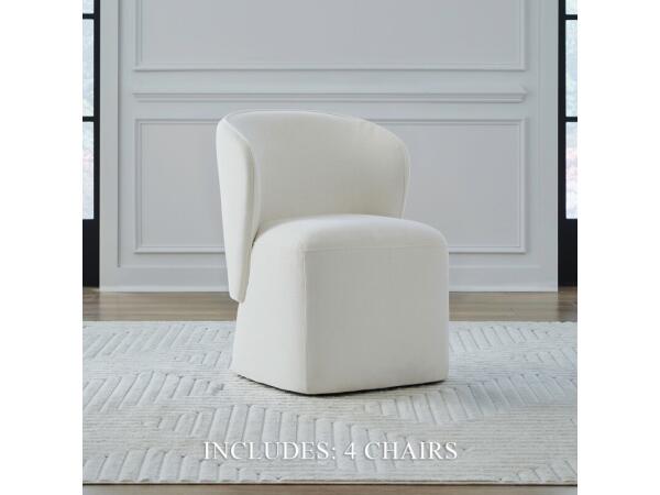 This elegant accent dining chair in Ivory fabric features gently sloping curves, an arched cap rail, and flared arms for sophisticated style. Equipped with casters for easy mobility, it functions perfectly as a versatile dining or accent chair.