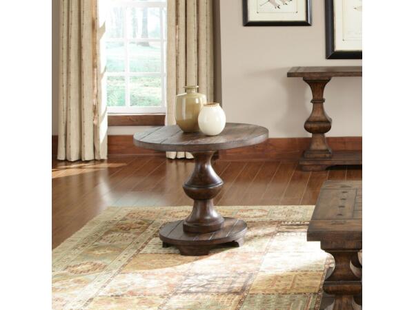 This Spanish style Sedona end table is crafted from rubberwood solids and oak veneers with a Kona brown finish. It features a planked top with square peg accents and a Spanish style round turned pedestal base.