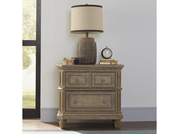 This two-drawer nightstand features premium construction with French & English dovetail joinery and cedar-lined bottom drawers. A built-in charging station with two outlets and two USB ports adds modern convenience.
