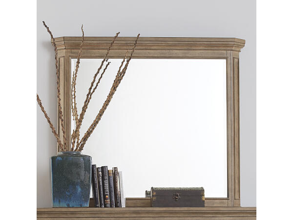 This landscape mirror features a beveled edge, canted corners, and heavy crown molding for a classic, sophisticated look. It is designed to complement traditional bedroom furniture.