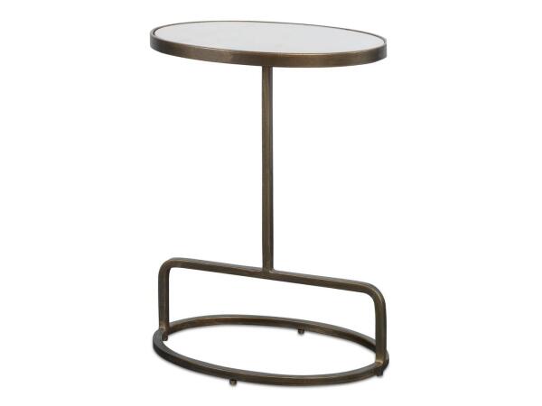Showcasing a clean-lined design, this accent table features an inset oval-shaped honed white marble top, supported with a hand forged