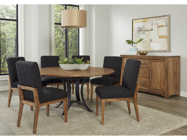 48 in. round dining table crafted from solid American cherry with a black metal base. Durable catalyzed finish highlights natural grain; made in the USA.