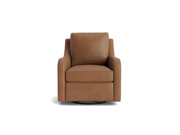 Leather slope-arm swivel glider chair with a supportive box seat and loose back cushions; soothing swivel-and-glide motion delivers club-chair comfort.