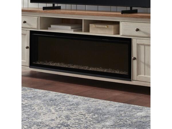 This 84-inch TV console is designed to accommodate an Infinity 50-inch firebox (sold separately) via a removable center shelf. It features two reeded pattern doors with European soft-close hinges and adjustable shelving.