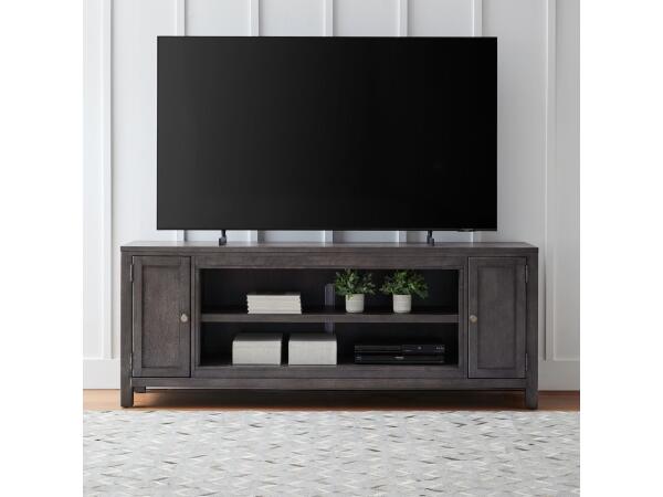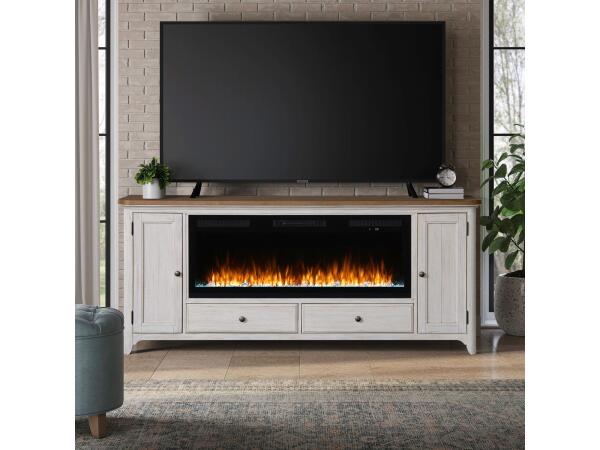 This 80-inch fireplace TV console provides organized storage with two large bottom drawers and two doors, each containing an adjustable shelf. The piece is accented with antique brass knob hardware and accommodates a Trend firebox (sold separately).