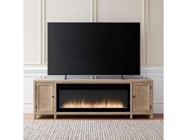 This 78-inch fireplace TV console features two wood-framed doors, each with an adjustable shelf for versatile storage. It is accented with washed brass knob hardware and is designed to accommodate a Trend firebox, which is sold separately.