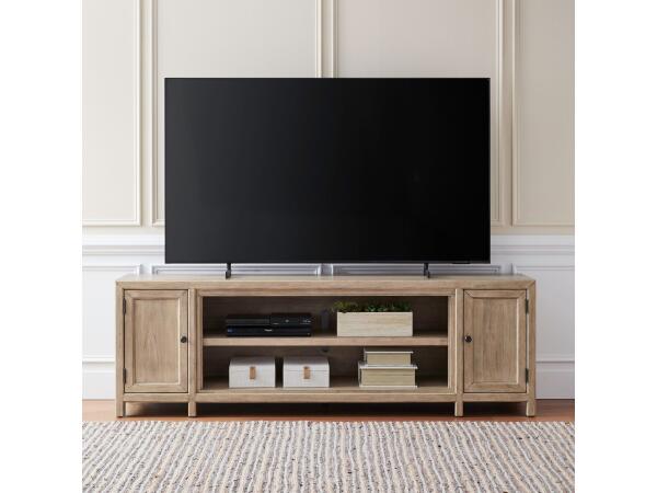 This 82-inch TV console offers organized storage with two wood-framed doors, each containing an adjustable shelf. The open center compartment includes a removable shelf to accommodate an Infinity firebox (not included) and features wire management provisi