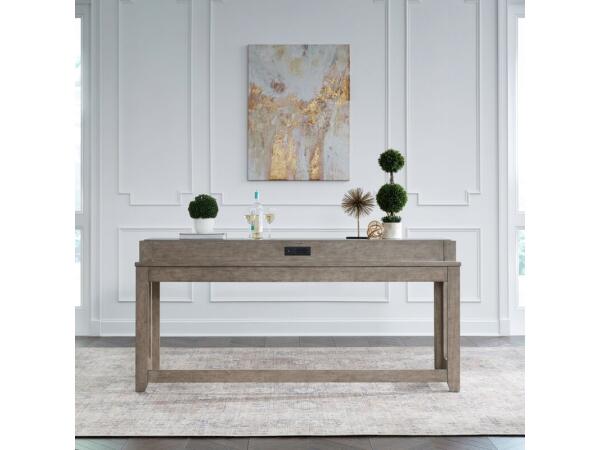 This console bar table features a unique tile insert on top and a built-in charging station with AC, USB-A, and USB-C ports. Its versatile design works well behind a sofa to provide extra seating and surface space.