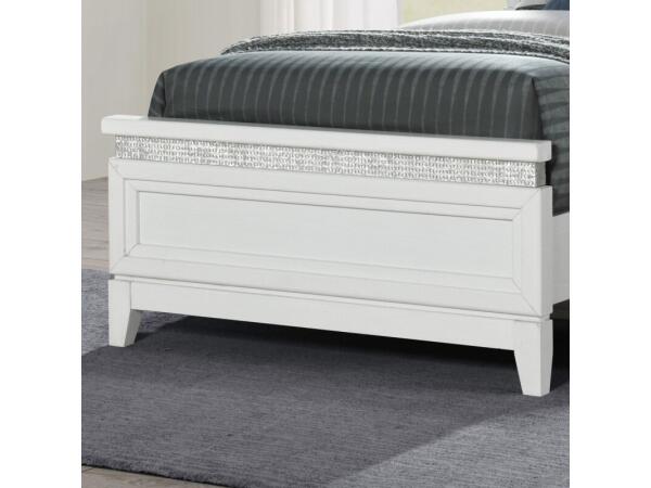 Crafted from Rubberwood solids with a Pearl White finish, this queen panel footboard enhances any bedroom. It features a floating style top, a rhinestone-accented apron for a touch of sparkle, and a tapered foot base.