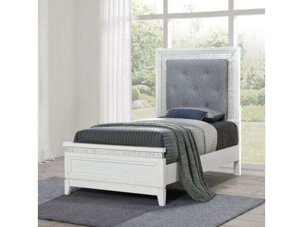 This full upholstered panel headboard is crafted from Rubberwood solids in a Pearl White finish. It features a button-tufted Gray Chenille panel, touch-activated LED lighting, and sparkling rhinestone accents.