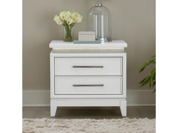 This nightstand is crafted from Rubberwood solids in a Pearl White finish, featuring a floating top, rhinestone apron, and touch LED lighting. It includes a built-in charging station with one USB-A and one USB-C port.