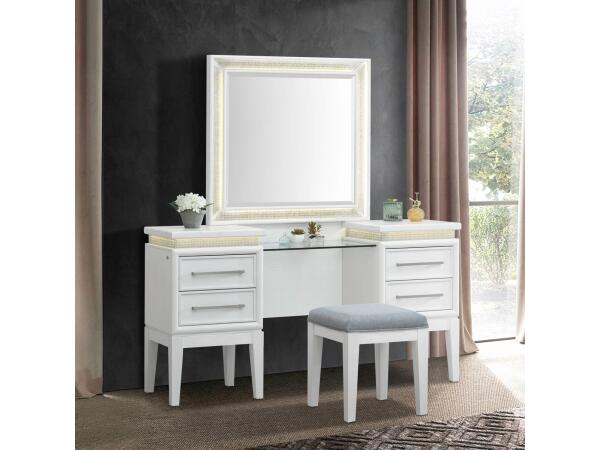 Crafted from Rubberwood solids with a Pearl White finish, this lighted mirror features a floating style with rounded picture frame molding. It includes rhinestone accents and touch-activated LED lighting and comes with bolt-on supports for dresser attachm