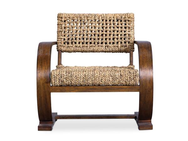 A modern bohemian accent, featuring a natural woven water hyacinth seat on a curved solid wood frame giving flexible movement,