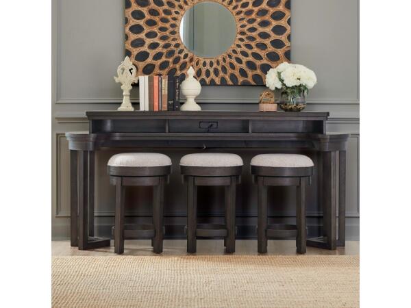 This Mill Creek console bar table is crafted from rubberwood solids and white oak veneers with a Peppercorn finish. It features three storage cubbies and a built-in charging station with 2 AC, 1 USB-A, and 1 USB-C port.