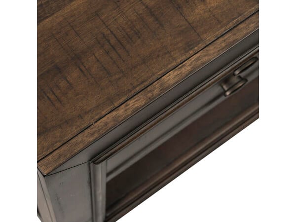 This Mill Creek drawer end table is crafted from rubberwood solids and split heart white oak veneers with a Peppercorn finish. It features one full extension drawer with a wood framed, beveled edge front and an open bottom shelf for storage.