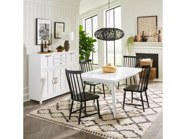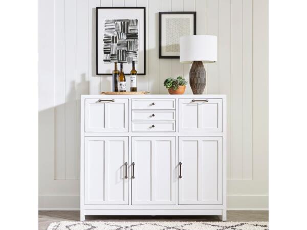 This Capeside Cottage buffet, crafted from rubberwood solids and China maple veneers, boasts a Porcelain White finish and clean lines. It offers ample storage with two deep and three smaller felt-lined, full-extension drawers, plus adjustable shelves behi