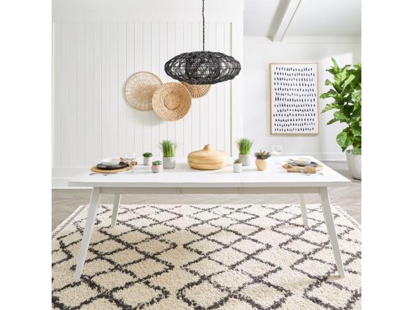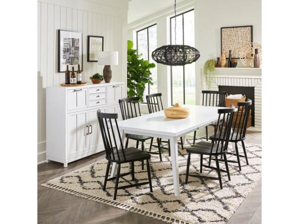 This Capeside Cottage rectangular leg table, crafted from rubberwood solids with China maple veneers, features a Porcelain White finish. It includes clean lines, splayed tapered legs, and one removable 20-inch leaf on a wood guide track system.