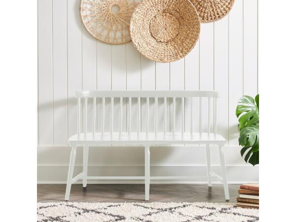 Crafted from rubberwood solids with a Porcelain White finish, this Capeside Cottage dining bench features a sturdy spindle back and saddle-shaped seat for comfort. It is equipped with splayed turned legs for stability and nylon glides to protect flooring.