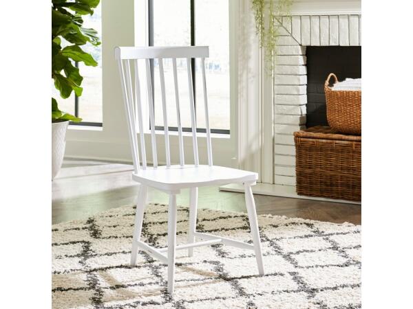 Crafted from rubberwood solids with a Porcelain White finish, this Capeside Cottage side chair features a contoured spindle back and saddle seat for comfort. It includes turned legs with an H-stretcher and nylon glides for floor protection.