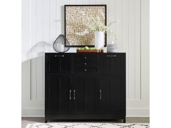 This Capeside Cottage buffet, crafted from rubberwood solids and China maple veneers, boasts a Royal Black finish and clean lines. It offers ample storage with two deep and three smaller felt-lined, full-extension drawers, plus adjustable shelves behind t