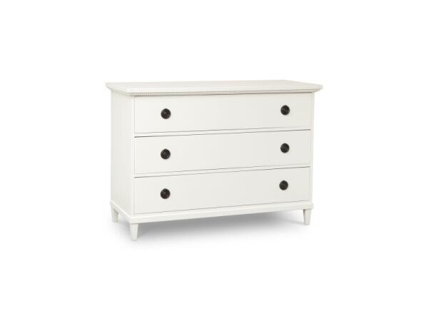 Wood accent chest with soft-close drawers, antique pewter ring pulls, and beaded edge detailing; 48 x 20 x 34 in.