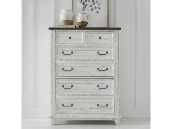 This River Place 6-drawer chest, crafted from Pine solids and veneers, features a distressed Riverstone White and Tobacco finish with farmhouse styling. It includes soft-closing drawer guides, premium felt-lined top drawers, cedar-lined bottom drawers, an
