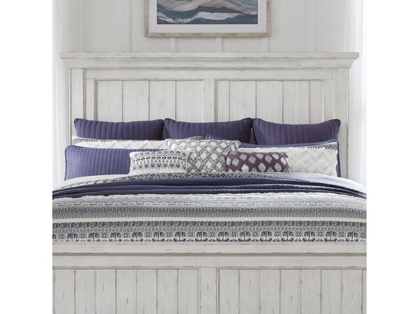 This River Place King Mansion Headboard is crafted from pine solids and veneers with a heavily distressed Riverstone White finish. It features heavy crown molding, high-low veneer panels, and wide pilasters for a classic farmhouse aesthetic.