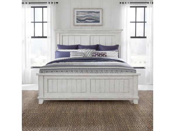 Crafted from pine solids and veneers, this River Place King Panel Footboard showcases a heavily distressed Riverstone White finish. It features a block style cap rail, high-low veneer panels, wide pilasters, and angled block feet.